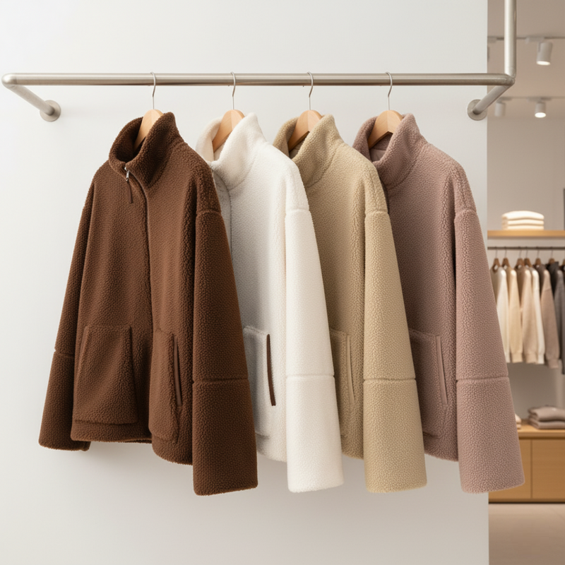 Met haar hoge kraag, ritsluiting en ruime zakken verenigt Adèle comfort en stijl in perfecte harmonie. De subtiele beige tint geeft haar een serene, verfijnde uitstraling — eenvoudig te combineren met elke look, van casual tot chic.