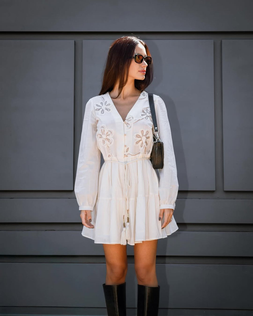 Crafted in a breathable cotton-blend, it’s designed to move with you — whether you’re slipping it on after a swim, dressing it up for golden-hour dinners, or layering it over your favorite set for a full Sunwear look. The deep V neckline, tiered hem, and rope-tie waist make it easy to wear and subtly shape-enhancing, while the embroidered florals add the softest touch of detail.
