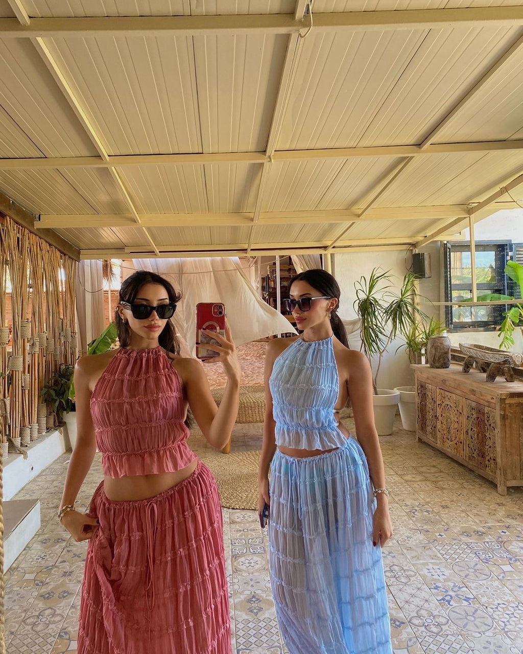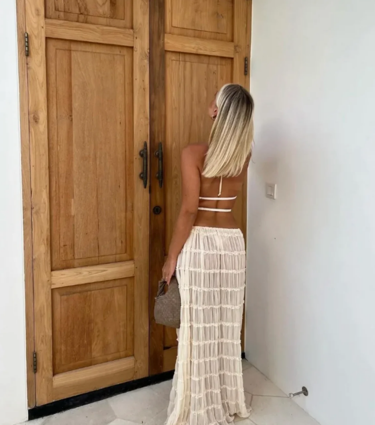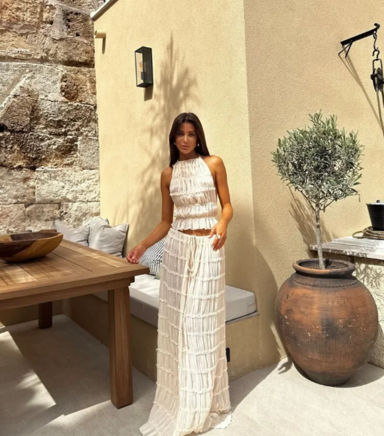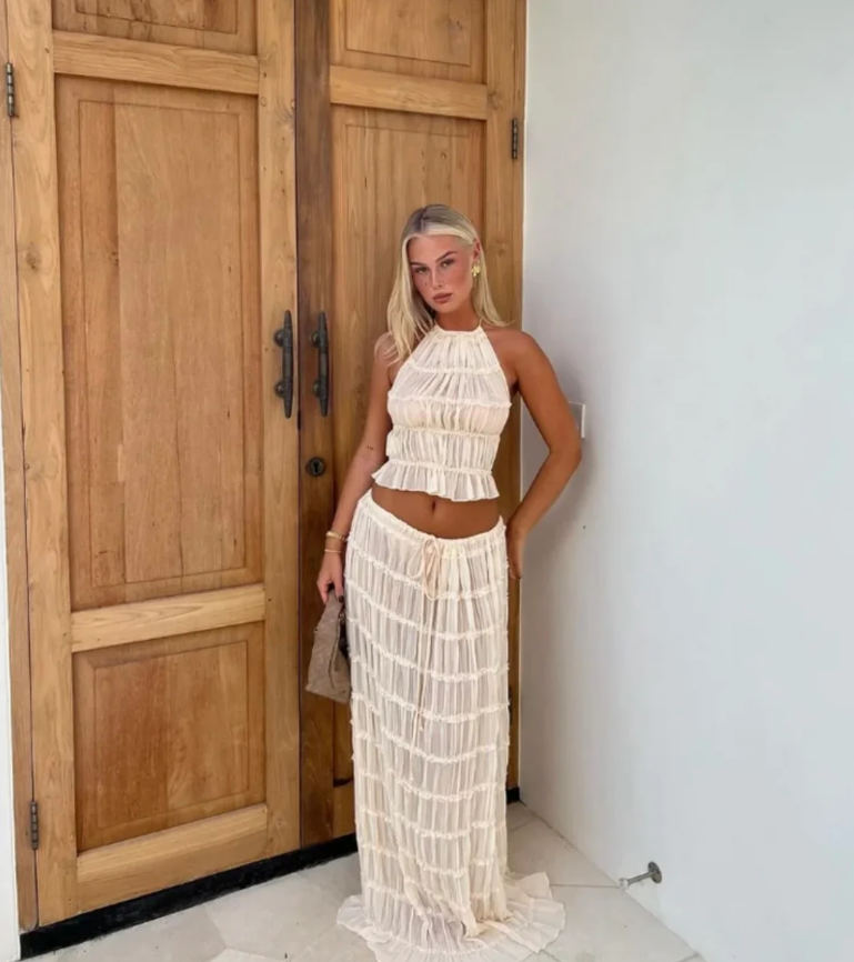A harmonious blend of elegance and ease, the Solène Set is your quintessential companion for sun-drenched days and balmy evenings. Crafted from lightweight, breathable fabric, this two-piece ensemble features a delicately ruffled top paired with a flowing skirt, embodying effortless sophistication. Slightly sheer in nature, its soft silhouette and subtle textures capture the essence of spring and summer, making it a versatile and airy addition to your seasonal wardrobe.